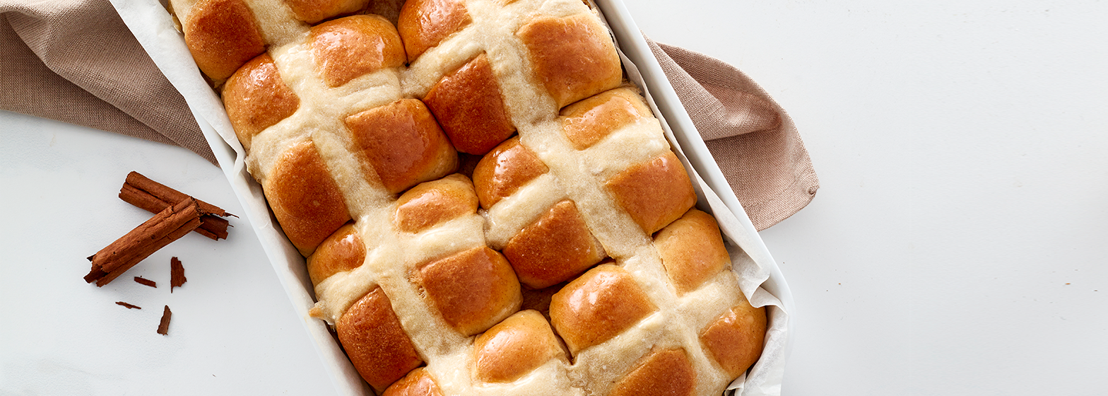 Hot cross buns er en engelsk påskeklassiker med en kristen oprindelse og en historie, som går næsten 1000 år tilbage i tiden. I dag er de søde, bløde boller med det karakteristiske kryds en fast langfredags-tradition på påskeborde i engelsktalende lande over hele verden. De seneste år er bollerne blevet et sandt hit på de sociale medier, og der findes i dag et væld af forskellige opskrifter – fra de helt klassiske til mere avancerede varianter baseret på f.eks. surdej eller bageldej. Her får du vores bud på den perfekte hot cross bun-grundopskrift. Nyd bollerne, som de er, eller pift dejen op med alt fra chokolade til tørrede bær.