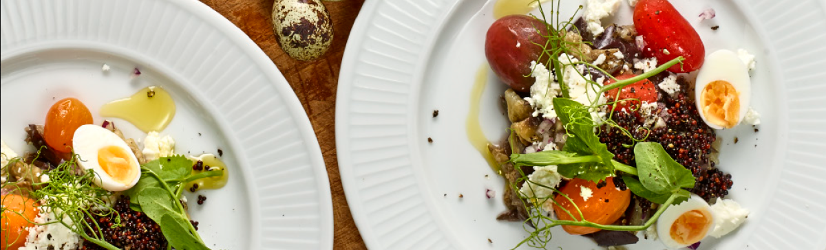 Skær de pillede vagtelæg i halve, og kom dem på retten.
