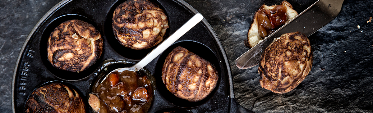 Information Antal 4 personer Sådan gør du1 Mel, æggeblommer, fløde, kornene fra vaniljestangen, citronskal, salt sukker og kardemomme piskes sammen. 2 Heri piskes det smeltede smør i og dejen piskes glat. 3 Umiddelbart før bagning vendes de stiftpiskede æggehvider i. 4 Varm æbleskivejernet op og pensl det med smeltet smør. Så skal der steges æbleskiver. Tip Serveres med marmelade.