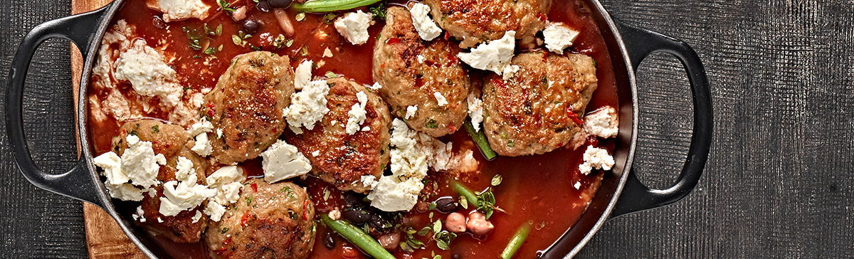 Information Antal 4 personer Sådan gør du1 Rør svinekødet med soyasauce, revet ingefær, hakket chili, knust hvidløg, æg, hakket persille, salt og peber. 2 Steg et lille stykke af farsen på en pande og smag om farsen evt. skal have mere salt og peber. 3 Kom rødvinen i en gryde, kog op og lad den koge ind til det halve. 4 Tilsæt flåede tomater, timian, bouillonterninger, laurbærblade, salt og peber og lad det hele simre under låg i 15 min. 5 Form farsen til frikadeller med en ske og steg dem på en pande til de er gyldne – ca. 5 min. på hver side. 6 Nip stilken af de grønne bønner og dræn samt skyl de blandede bønner. 7 Kom alle bønner i gryden med tomatblandingen og lad det simre i 5 min. 8 Læg de stegte frikadeller i gryden og drys med knust fetaost. Server straks.