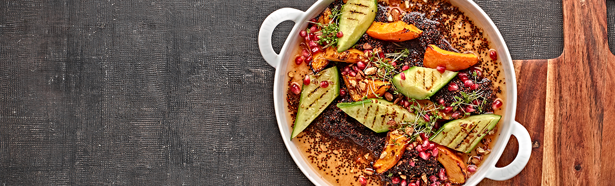 Information Antal 4 personer Sådan gør du?1 Flæk græskaret og skrab kernerne ud med en spiseske. 2 Skær det i grove stykker og vend med olie, salt og peber. 3 Bag stykkerne i en forvarmet ovn i 25 min. ved 200° C. 4 Kog quinoaen i saltet vand i 8 min., dræn vandet fra og skyl med koldt vand. 5 Flæk granatæblet og tag kernerne ud ved at banke på skallen med en ske. 6 Flæk agurken og grill den 4 min. på hver side på en pande og krydr med salt og peber 7 Hak mandlerne og rist dem gyldne på en tør pande, ca. 5 min. 8 Kog bouillonen op med karry og tilsæt quinoaen, varm det igennem og anret på et fad. 9 Læg de bagte græskar og de grillede agurker på og drys med granatæblekerner, mandler og karse. Server straks.