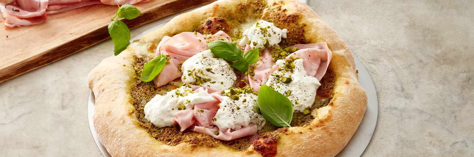 Pynt den færdigbagte pizza med skiver af mortadella, burrata og hakket pistacie.