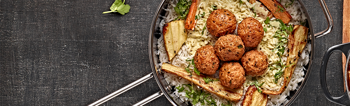 Information Antal 4 personer Sådan gør du1 Rør svinekødet sammen med bouillon, mel, æg, hakket timian og salt og peber. 2 Steg et lille stykke af farsen på en pande og smag om farsen evt. skal have mere salt og peber. 3 Form farsen til boller og rul dem mellem hænderne, så de bliver helt runde og ensartede. 4 Skræl rodfrugterne, skær dem i grove stykker og vend i lidt olie, salt og peber. 5 Bag stykkerne på bagepapir i en forvarmet ovn i 25 min. ved 200° C 6 Bring kokosmælken i kog og tilsæt bouillonterninger og karry og lad den simre, til den begynder at tykne. 7 Kog risene som anvist på pakken og hold dem varme under låg. 8 Varm olien op i en gryde til 180° C og fritér kødbollerne, til de bliver gyldne – ca. 3-5 min. 9 Tag dem op af olien og lad dem dryppe af på fedtsugende papir. 10 Hæld saucen over risene, læg kødboller og rødder ved og drys med grofthakket koriander. Server straks.