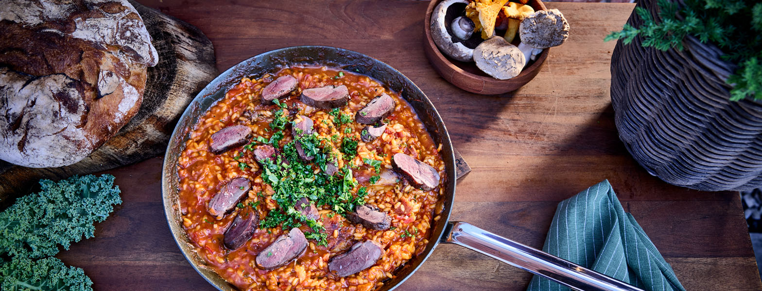Cremet risotto med mørt vildtkød, svampe og rosmarin – en lækker vinterret med masser af smag og varme.