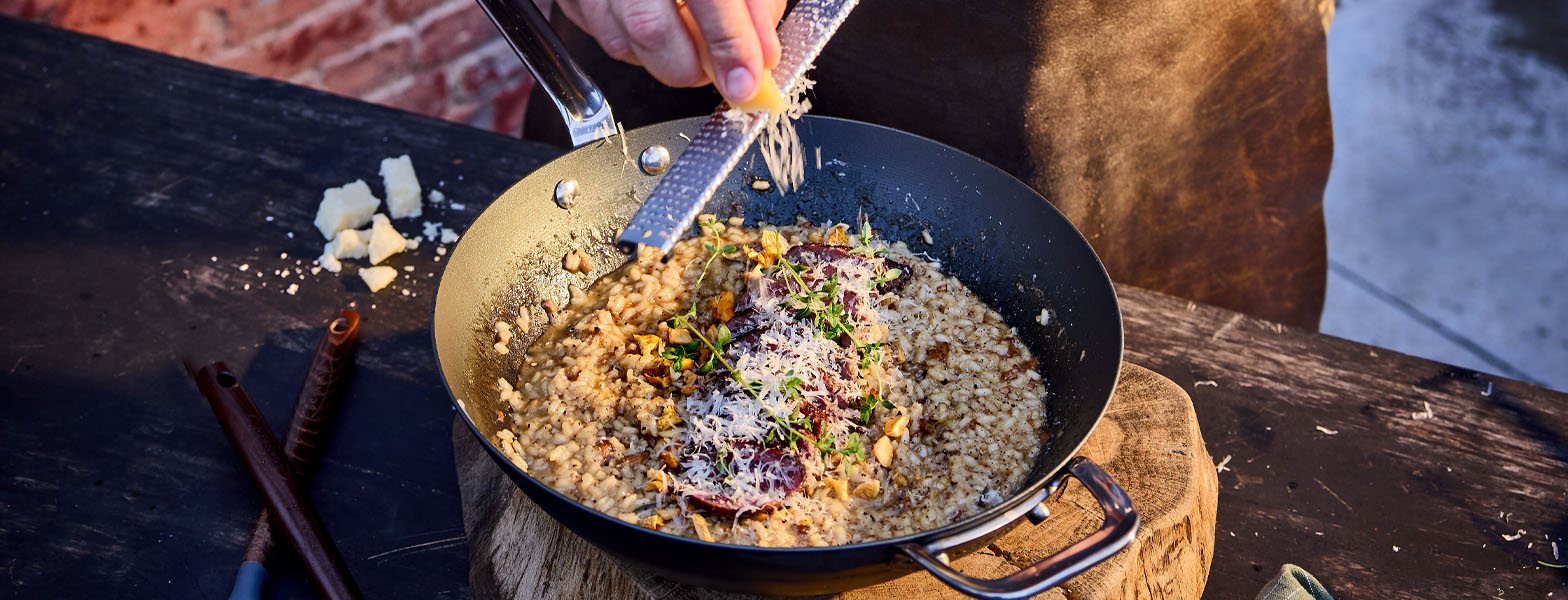 Cremet risotto med mørt vildtkød og sprøde svampe – tilberedt over grillen eller bålet for ekstra dybde og aroma. Med et strejf af rosmarin og friskrevet parmesan bliver hver mundfuld en varm og smagfuld oplevelse til vinterens hyggelige aftener.