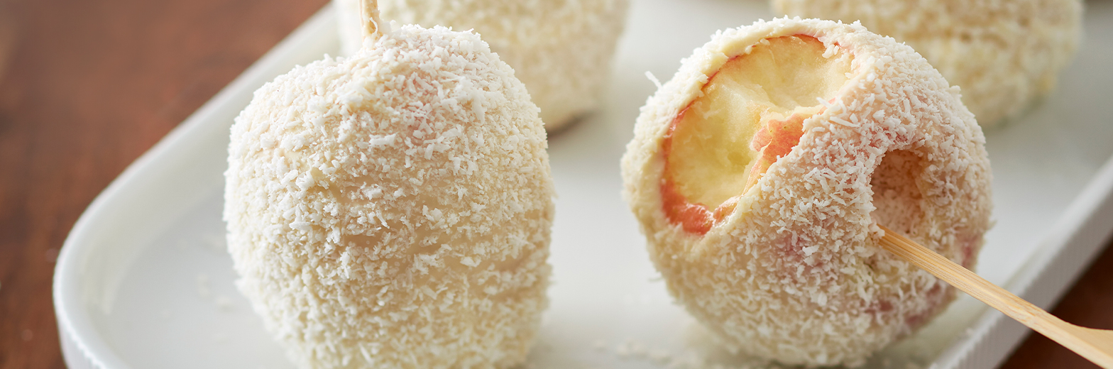 Forkæl ungerne med next-level kandiserede æbler med hvid chokolade og kokos. Nydelse på en pind, der vækker minder om en svunden tid.