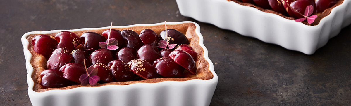 Information Antal 6-8 personer (4 tærter) Mørdej1 Smuldr hvedemel, flormelis og blødt smør til det minder om brødkrummer. 2 Saml dejen hurtigt med æggeblommerne. 3 Stop med at ælte, så snart dejen er ensartet. 4 Kom dejen i en frysepose, tryk den lidt flad, og læg den på køl i mindst 1 time. Mazarinfyld med kirsebær1 Ælt rå marcipan, rørsukker og smør godt sammen, gerne med hænderne – ingen marcipanklumper. 2 Rør ægget i massen til den er homogen. 3 Ælt mørdejen kort sammen og udrul herefter delen på et let drysset melbord i 2-3 mm tykkelse. 4 Kom dejen op i tærteformene (små portionsforme) og fjern overskydende dej. 5 Kom mazarinfyldet op i den ubagte tærte. 6 Skær kirsebærret midt over og fjern stenen. 7 Placer dem i tærterne. Pres dem lidt ned i mazarinmassen. 8 Bag tærterne ved 190 °C varmluft i ca. 20 min. 9 Lad tærterne køle helt af i formen. I øvrigt1 Pensl tærterne med lidt kirsebærlikør. 2 Skær kirsebærrene over og fjern stenen. 3 Dekorer tærterne med 3 rækker af friske kirsebær og pynt af med skovsyrer og guldstøv.