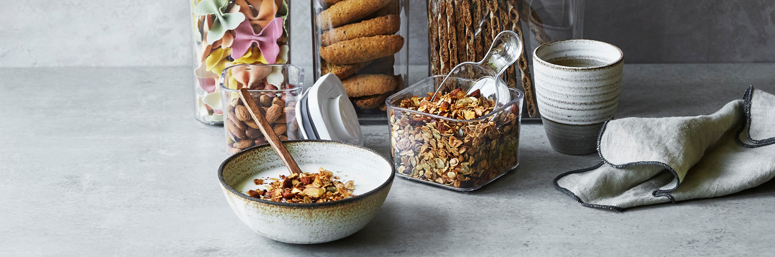 Information Opbevaring 6-8 uger. Sådan gør du1 Tænd ovnen på 160 grader varmluft. 2 Smelt smørret på en lille pande og tilsæt honning. 3 Hak nødder og mandler groft og vend dem i en skål med havregryn, rug- og speltflager. 4 Hæld honningsmørret i nødde- og kornblandingen og vend rundt. 5 Kom blandingen på en bradepande, bred den ud og rist den i ovnen i ca. 10 minutter. 6 Vend rundt i granolaen og rist den videre i ca. 10 minutter, til det er gyldent. 7 Sluk for varmen og lad granolaen tørre i ovnen med halvåben ovnlåge. Tip Opbevar din granola i en POP Container, så holder granolaen sig sprød i 4-6 uger.