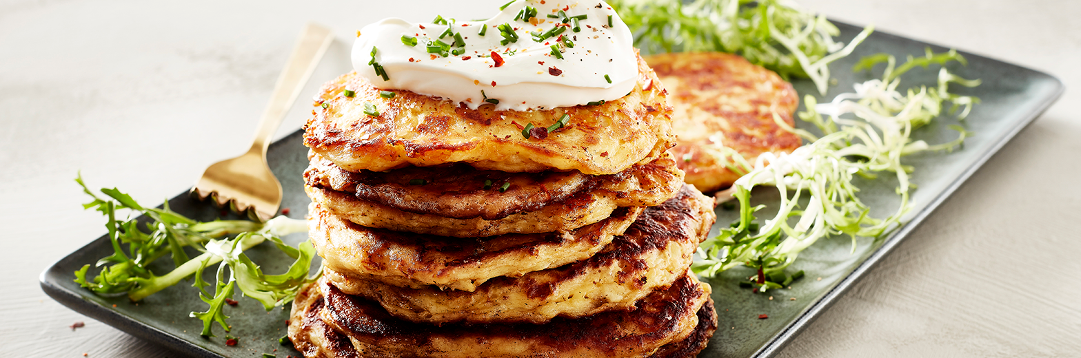Du kan lave sprøde pandekager af kartoffelmos på et øjeblik – og med en kartoffelmoser bliver arbejdet endnu lettere. Det er en dejlig afveksling til de kogte, bagte eller brasede kartofler, og de smager superlækkert til stort set alle retter, hvor du normalt ville servere kartofler som tilbehør. Prøv også at anrette dem med lidt hjemmelavet creme fraiche-dressing og lidt røget laks for ekstra lækkerhed.