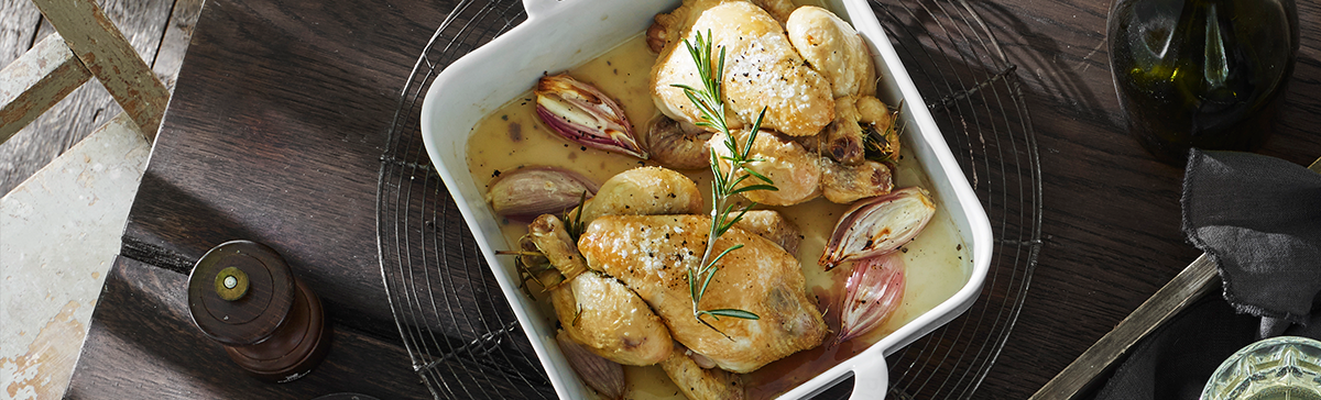 InformationSådan gør du1 Læg kylling i et grillfast fad, som er stort nok til også at rumme grøntsagerne. 2 Kyllingen skal gnides med olie og krydres med salt, peber og rosmarin. 3 Derefter sætter du fadet på grillen ved god, indirekte varme. Sæt låg på grillen og lade kyllingen stege i ca. 15 minutter. 4 Imens kan du klargøre grøntsagerne. Skær squash, røde peberfrugter og citron i grove stykker. 5 Læg det sammen med smørret i fadet til kyllingen og steg færdig ved indirekte midddelvarme - med grill-låget på - i ca. 45 minutter. 6 Smag grøntsagerne til med salt og peber, og servér. Tip Sådan tjekker du, at kyllingen er færdig: åbn lidt op ved kyllingelåret - hvis væsken derfra er klar, er kyllingen færdig.