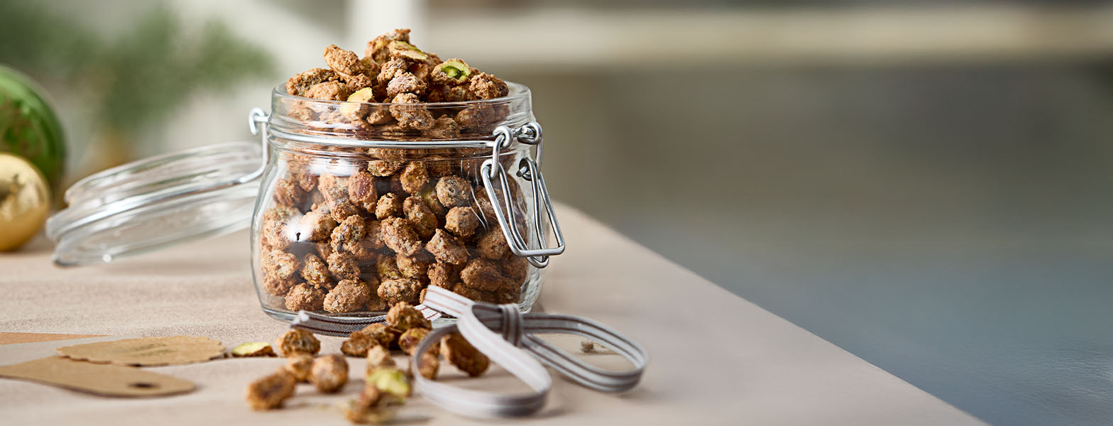 Der er noget særligt ved duften af karamelliserede nødder, der spreder sig i køkkenet. De sprøde, søde pistacienødder er et lækkert twist på de klassiske brændte mandler – og den perfekte, hjemmelavede værtindegave.