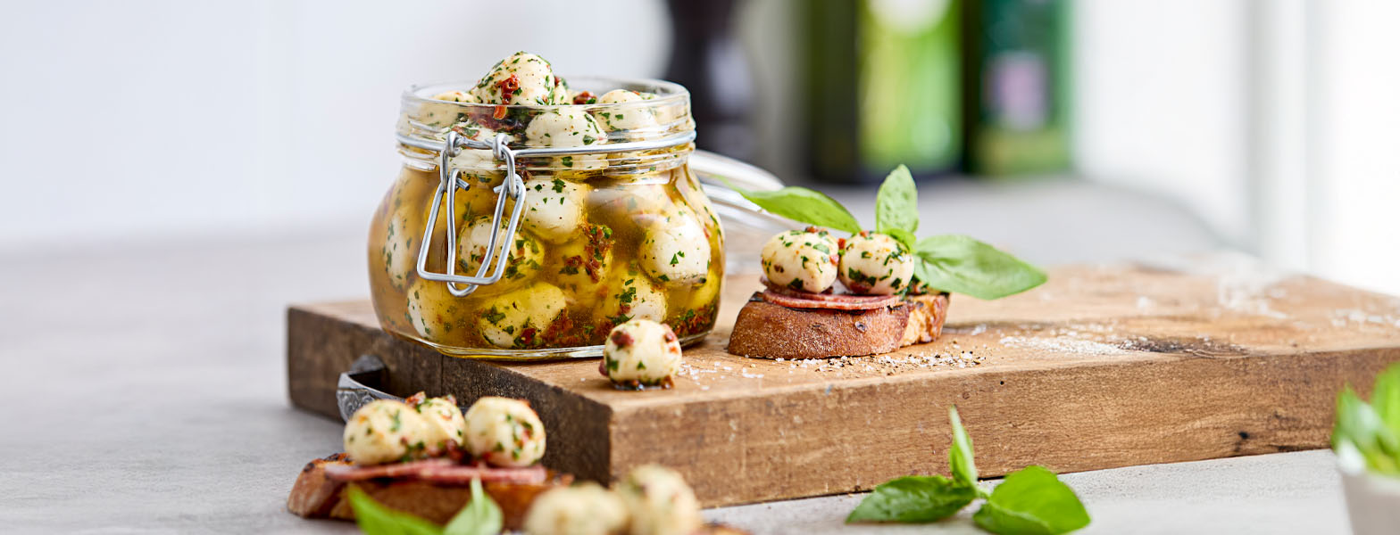 Små, cremede kugler af mozzarella fyldt med smag fra urter, hvidløg og et strejf af chili. En enkel og lækker måde at pifte hverdagsmaden op på – lige til at sætte på bordet, når maden skal have det lille ekstra.