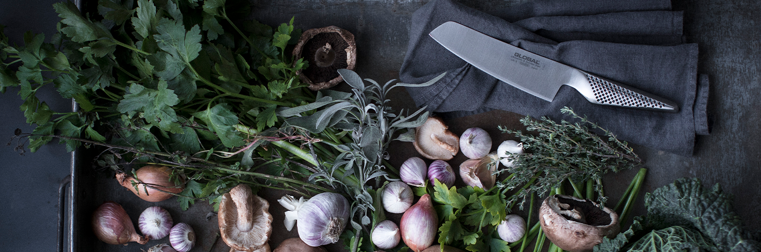 Global knivene er slebet i en skarp, spids vinkel. Dette gør det muligt at slibe knivsæggen til ekstrem skarphed. Sammenholdt med at knivene er hærdet til 56-58 på Rockwell skalaen, giver det knive i topkvalitet, som holder i mange år.