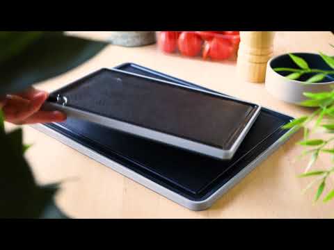 To gode størrelser skærebræt med et smart ophængningshul, så de kan hænges på væggen i stedet for at ligge i en skuffe. Selve skærefladen er sort, og i kanten er der en fin detalje i grå samt saftrille på begge skærebræt. Målene er: 27x19x0,9 cm + 35x25x1 cm.