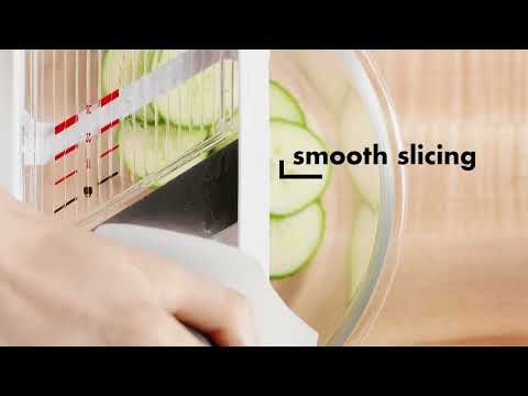Med en praktisk fingerbeskytter kan du skære sikkert, og når arbejdet er færdigt, kan holderen placeres over bladet for sikker opbevaring. Dette pladsbesparende køkkenredskab tåler opvaskemaskine og passer nemt i køkkenskuffen – perfekt til hurtige og professionelle resultater i køkkenet!